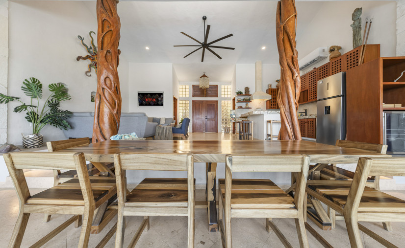Dining table seats 8–10 adults comfortably